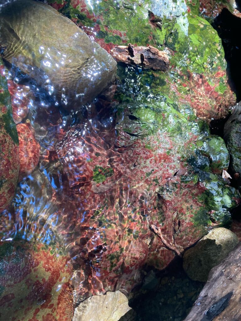川には水がきれいなところにしか生殖しない赤い苔も。名前忘れた。。